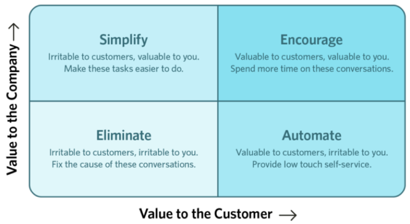 - Breng in kaart waar je bot waarde toevoegt. Kijk eens naar de irritant grid, ook wel value grid genoemd: waar voeg je waarde toe voor de klant en waar voeg je waarde toe voor het bedrijf? Zeker in de hogere waardesegmenten wil je dat je bot conversie gaat krijgen.