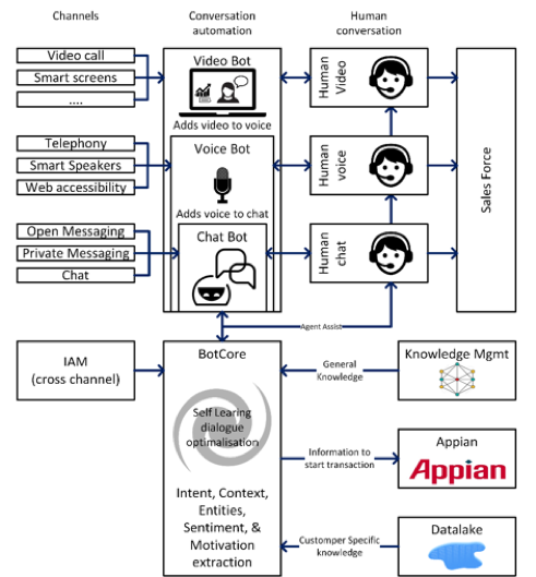 80% van de conversaties is te automatiseren. Niet alleen via chat, maak ook via voice en video. De inhoud van een conversatie wijzigt niet door de keuze van het kanaal, alleen de manier waarop de informatie wordt overgebracht. Alleen als de bot er niet uitkomt, of we dit zelf willen, wordt een gesprek geëscaleerd naar een medewerker.
